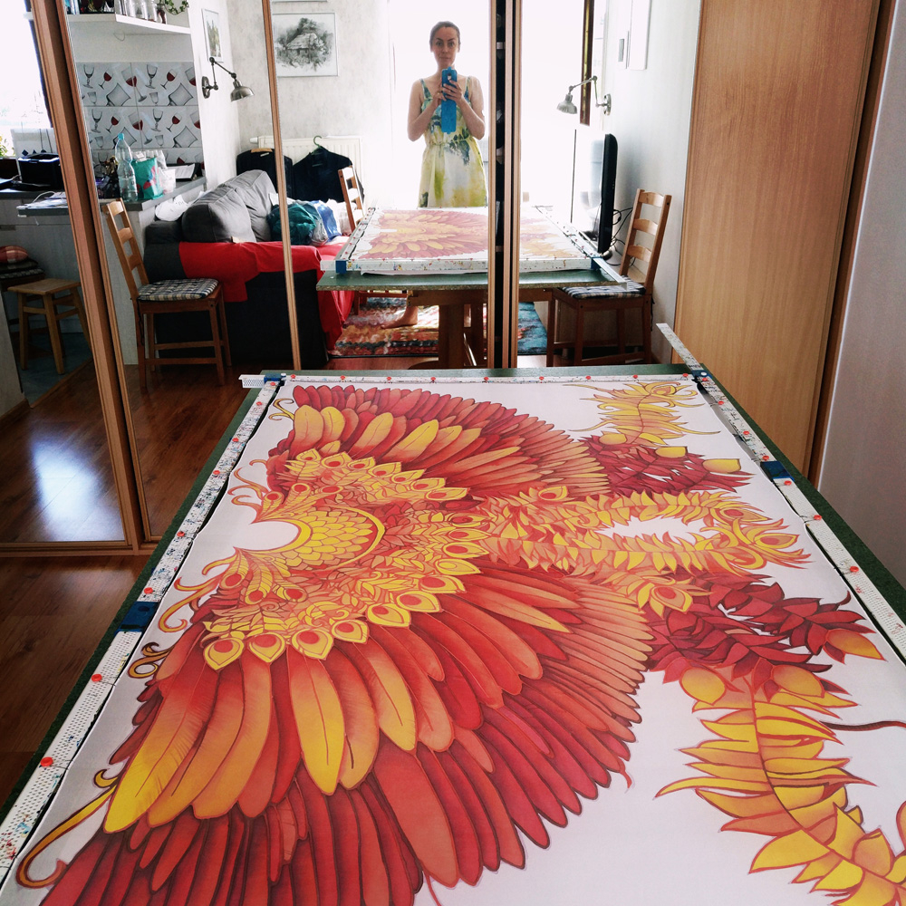 The Firebird Wings scarf painted with outlines! There's me in the mirror! |